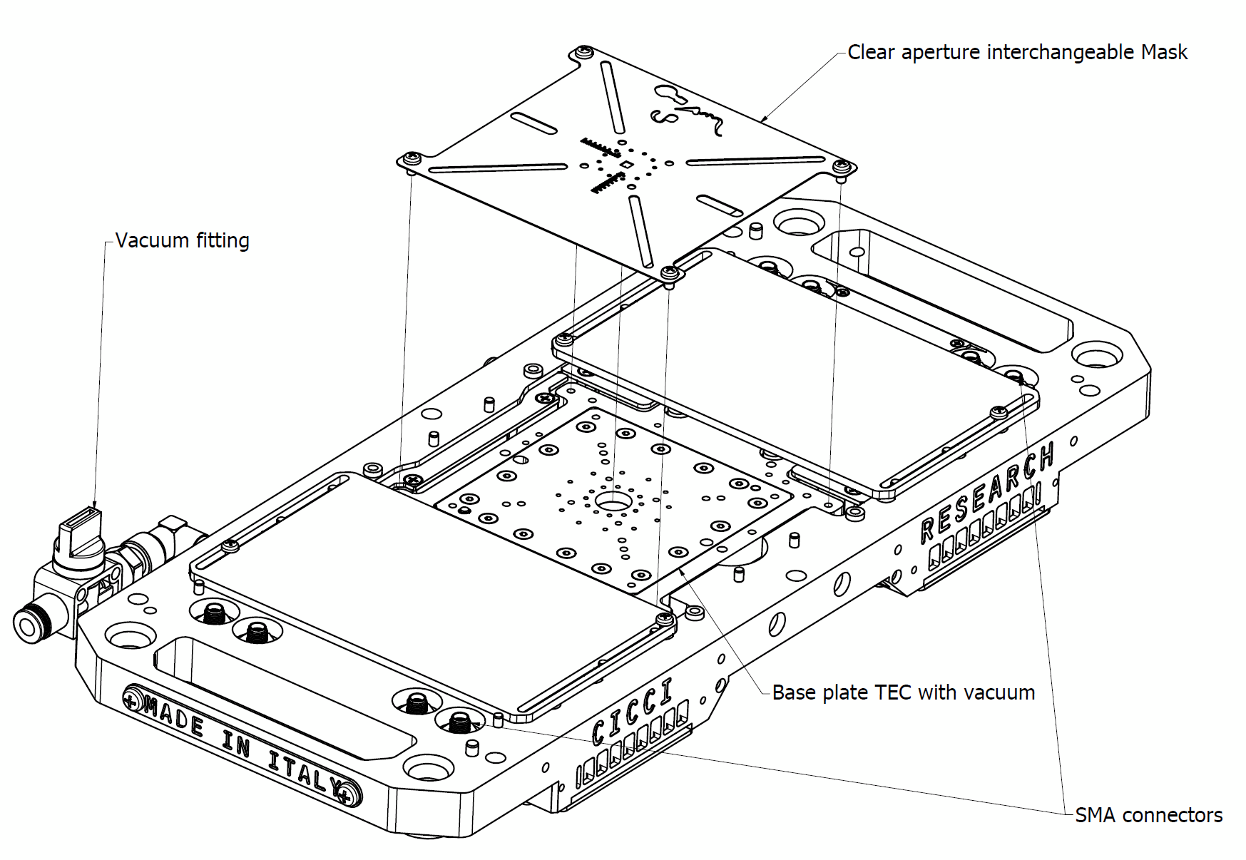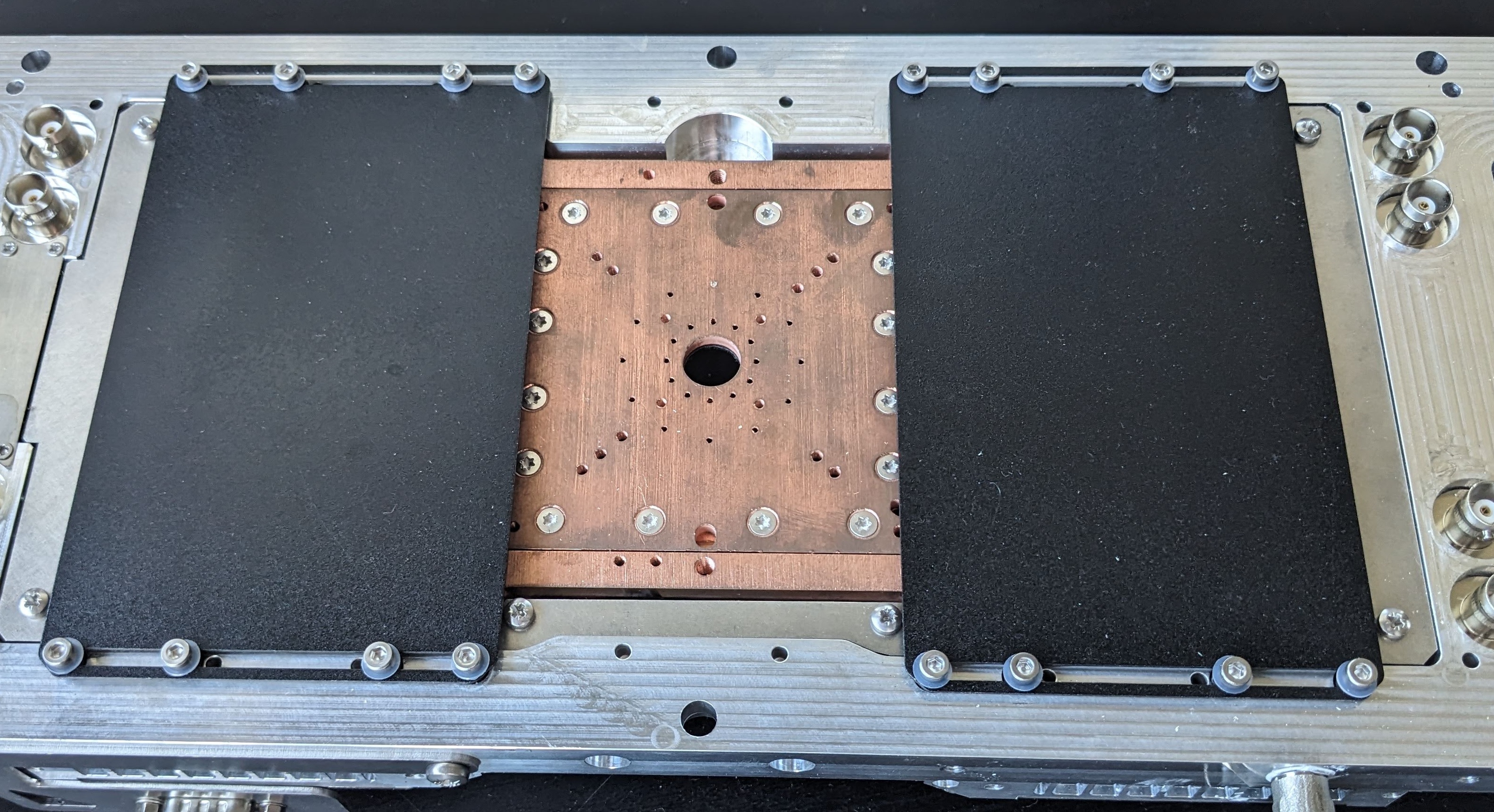 At the core of the stage is a copper base plate on which the device under test (DUT) is placed. Copper is chosen for its high thermal conductivity, ensuring efficient heat spreading and stable temperature control when combined with the underlying TEC system.
