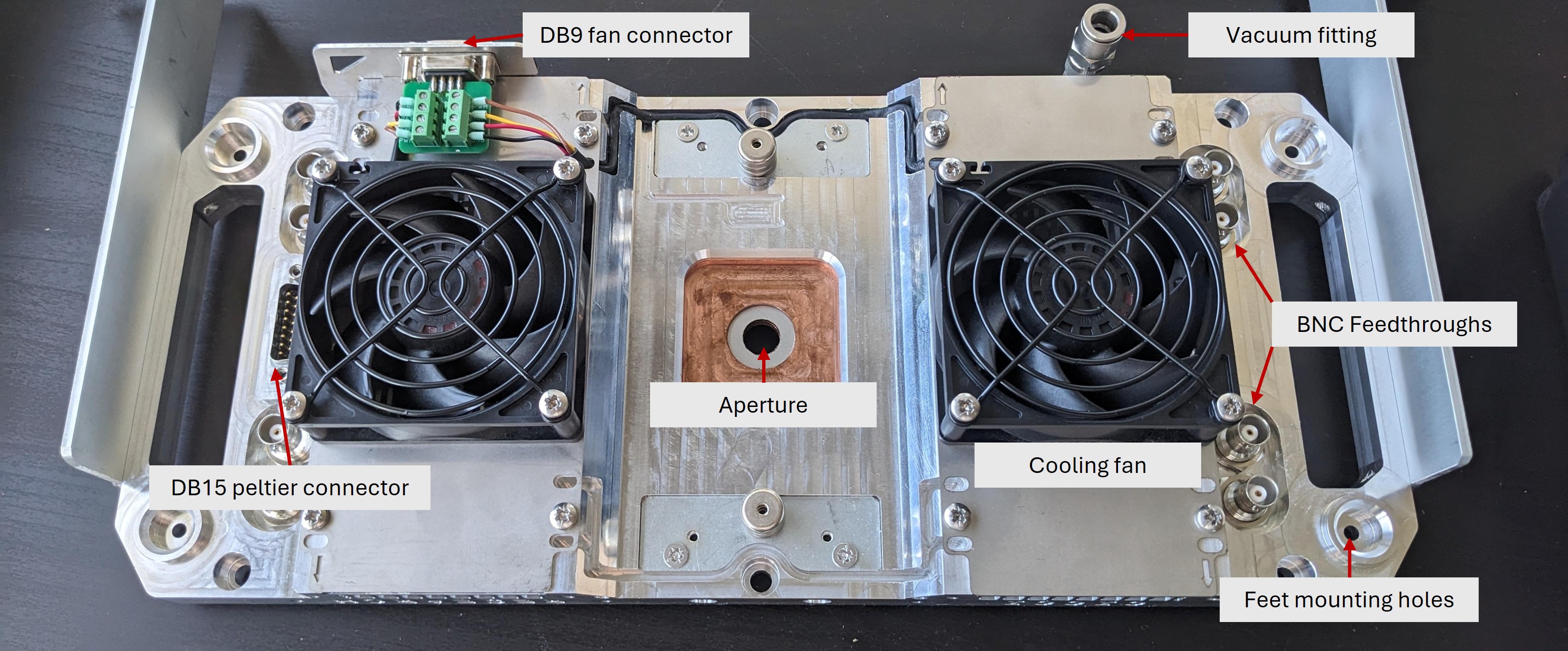 The Peltier elements interface with the measurement system through a standard DB15 connector, while the cooling fans are connected via a DB9 connector. This standardized electrical integration allows reliable control, straightforward system interfacing, and modular servicing of the thermal components.