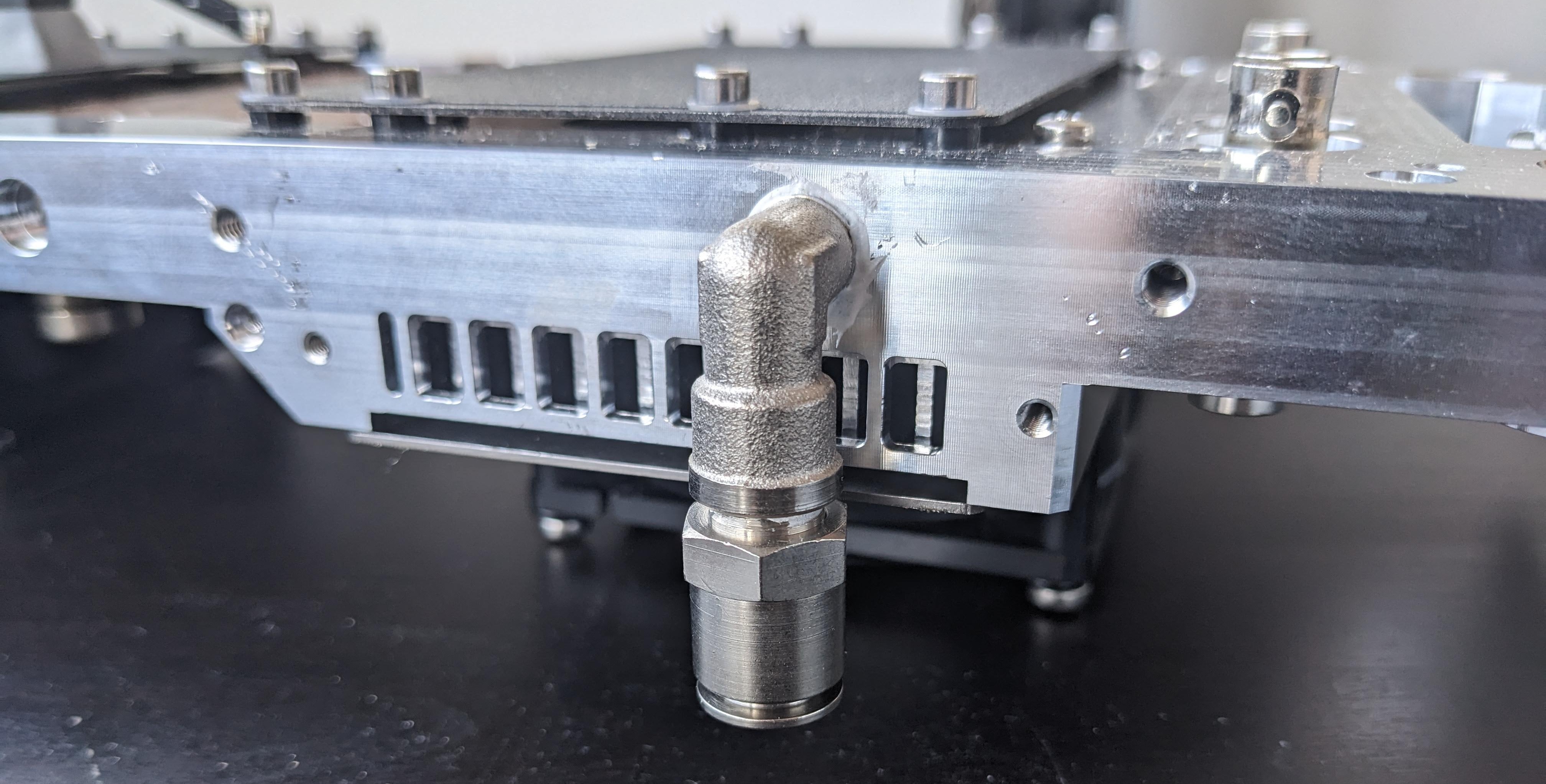 A vacuum fitting is integrated into the stage to enable fixation of flexible or lightweight substrates directly onto the base plate. This is particularly useful for: