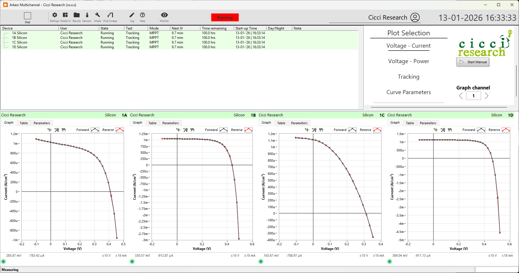 Four channels are shown together in each graph window, matching the organization of the four-channel SMU hardware. New data points appear as the measurement proceeds, and the full JV curve is updated after each completed scan.